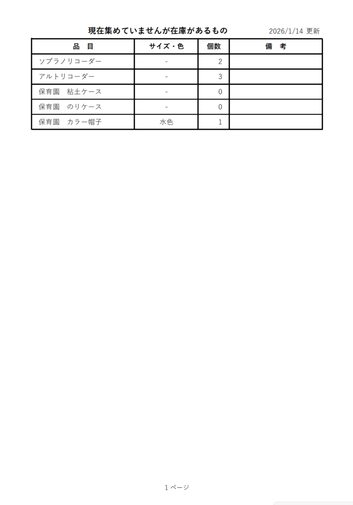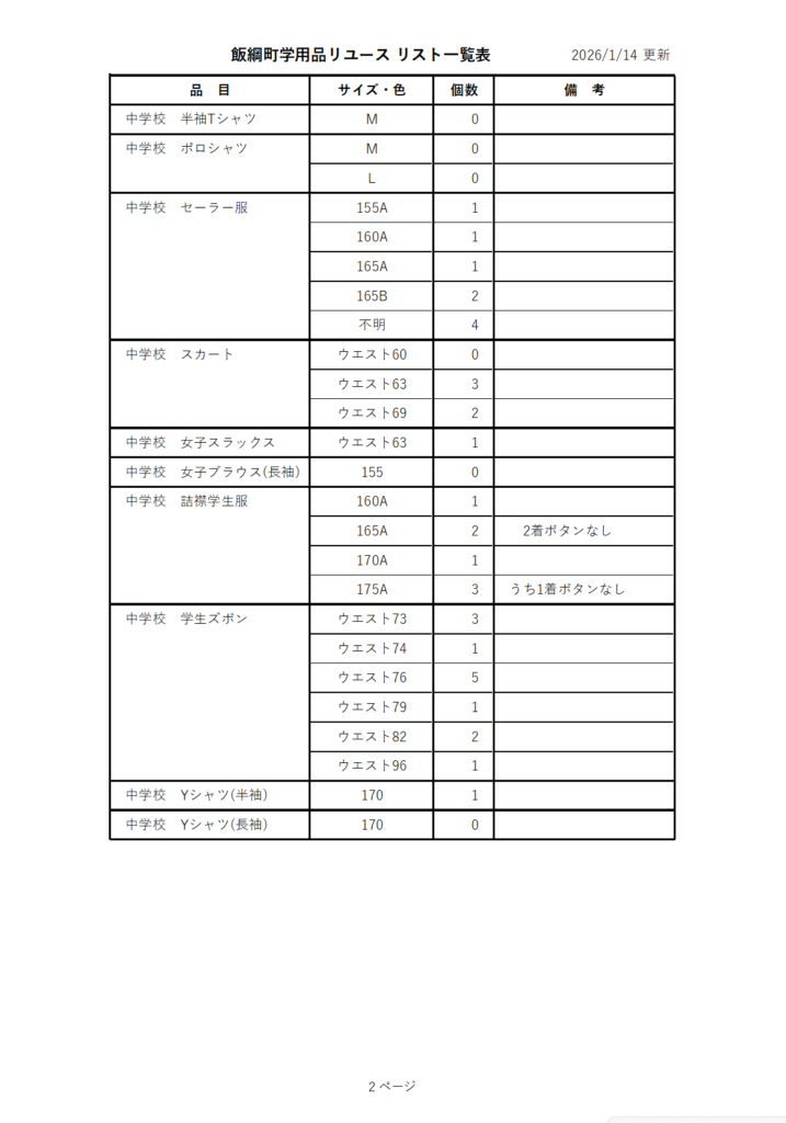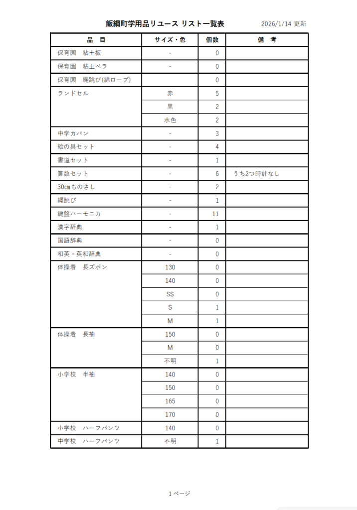 飯綱町学用品リユース 在庫情報